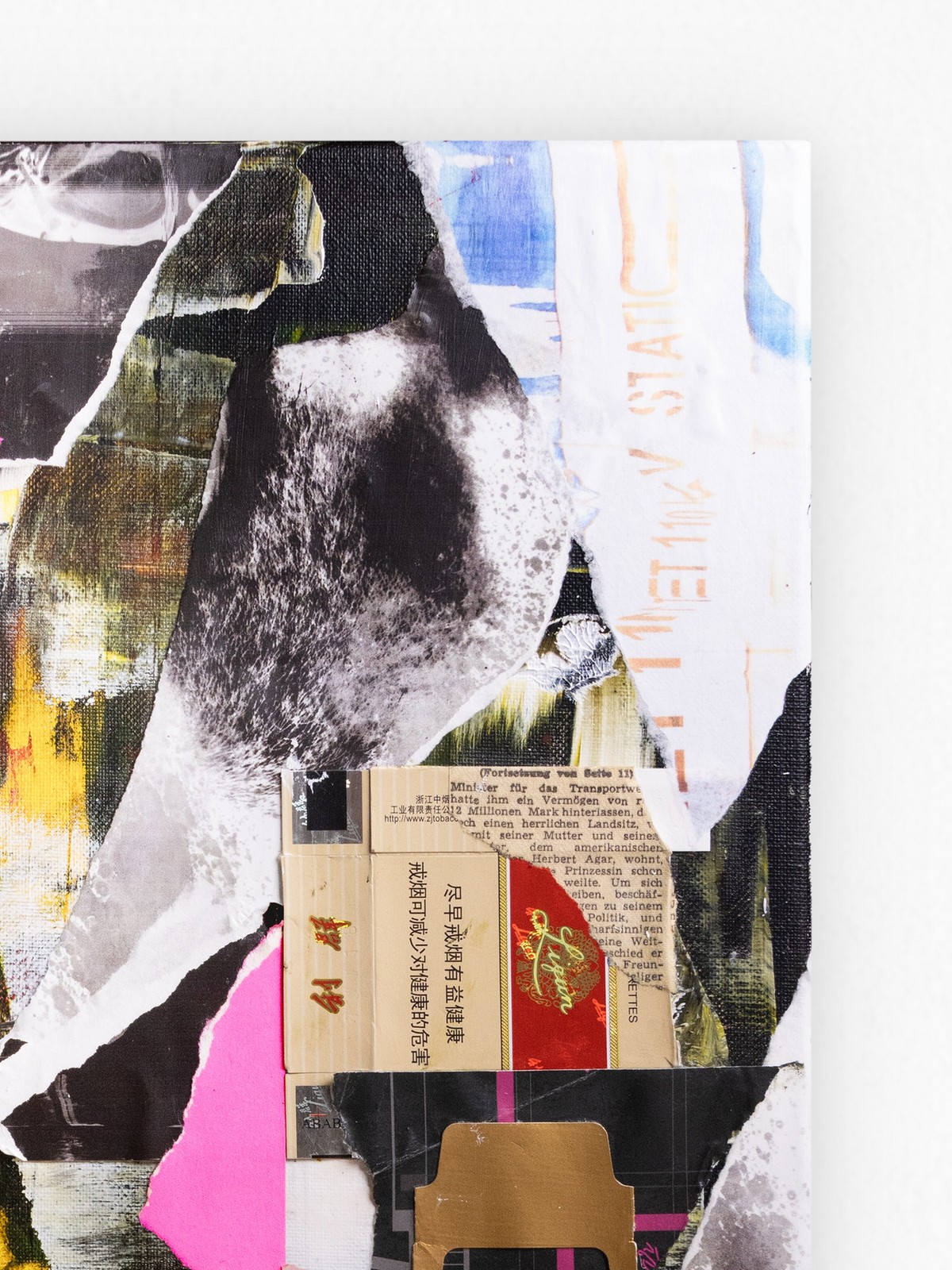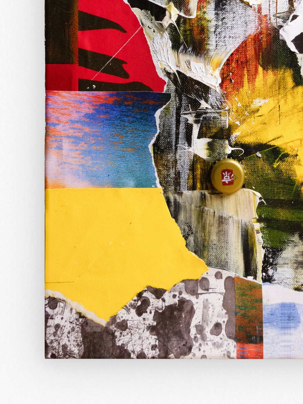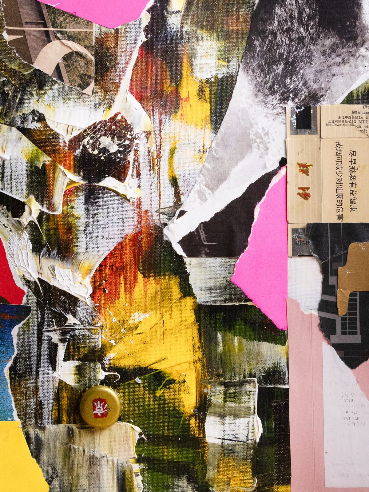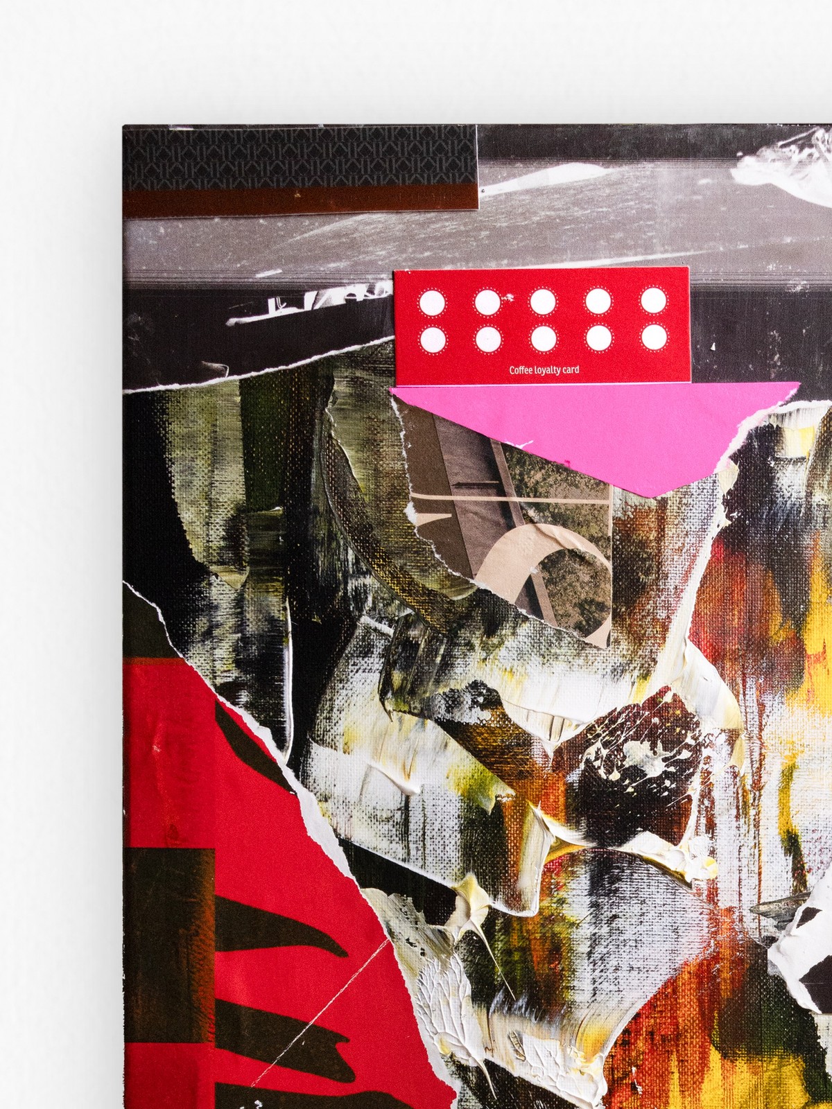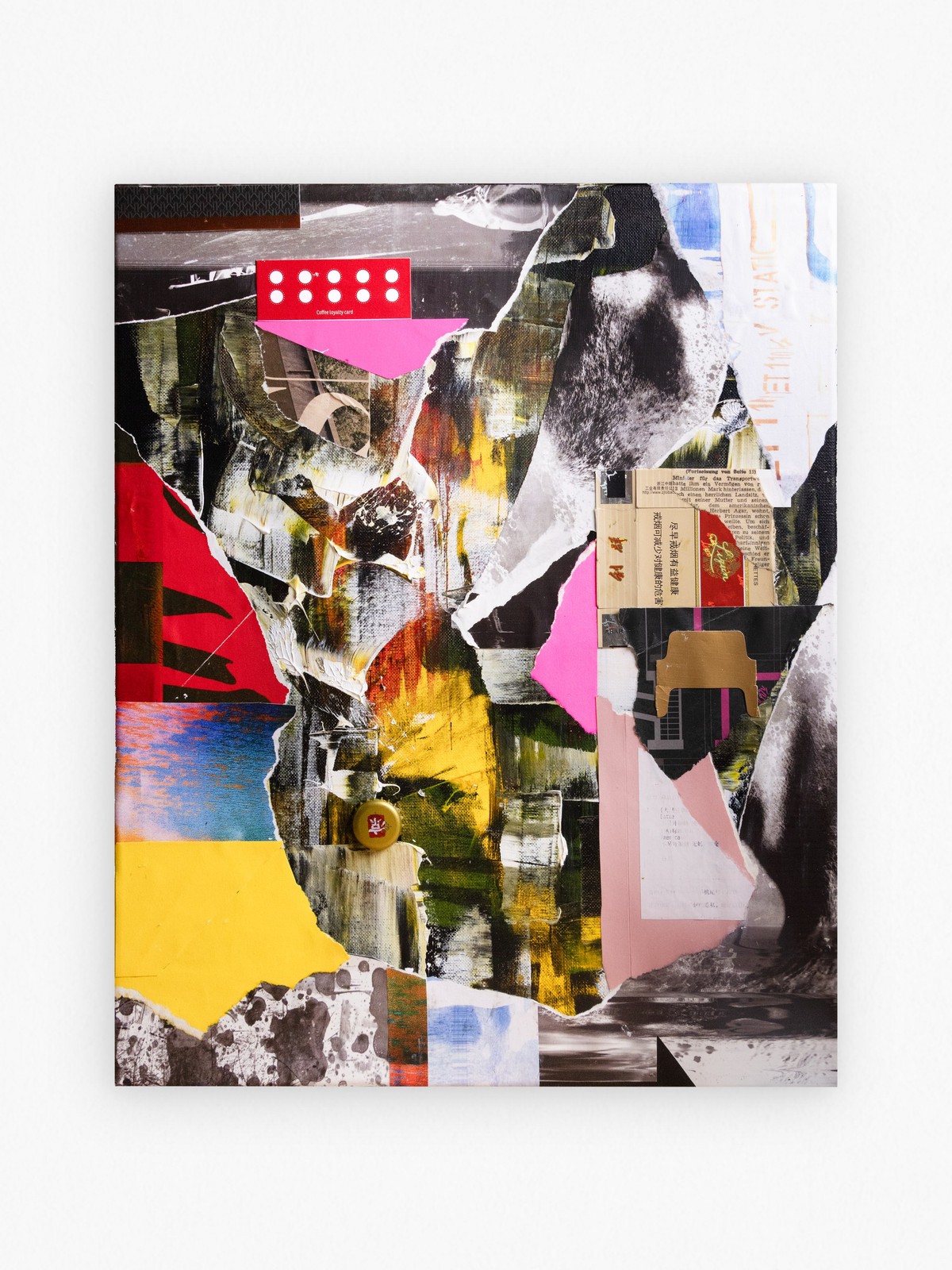 This mixed media collage combines an intuitive abstract layer of paint as its foundation with cigarette packaging, a loyalty card, and distorted scans of personal photographs. It explores themes of connection and commitment, transforming discarded materials into a vibrant narrative of renewal and loyalty to the creative process. This artwork has been varnished in matte using professional and archival standards. A certificate of authenticity is provided with artwork, and a floating frame can be added at an additional cost. Please contact hello@poetonic.com for framing add-ons. Layered Mixed Media - Acrylic, oil pastels, and reclaimed paper over collage on canvas.