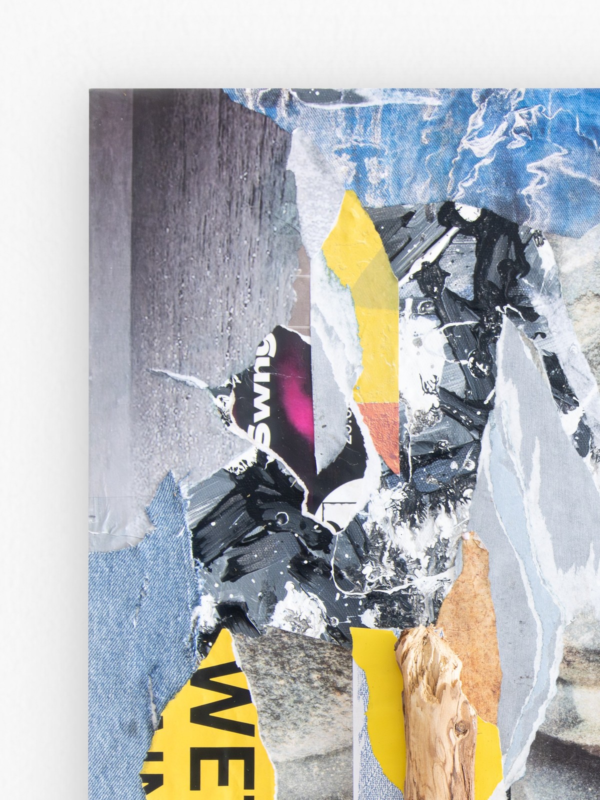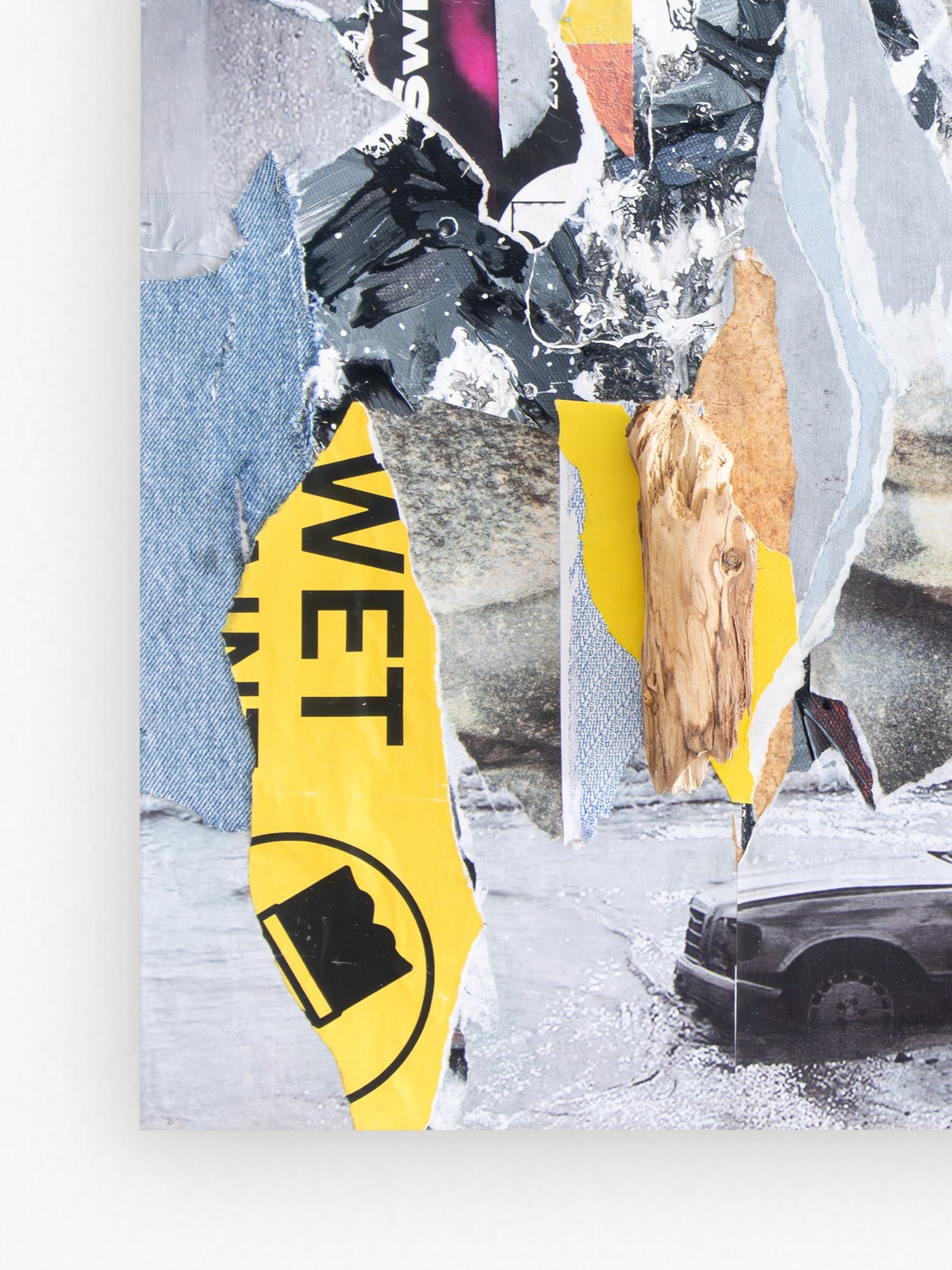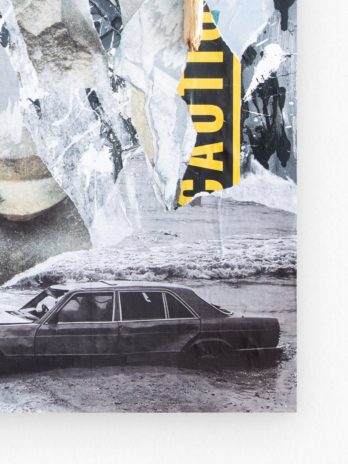The city's guts ripped open, bits of what we built scattered like discarded lottery tickets. That car, probably somebody's big shot idea of progress, now just a drowned bug. There's an eye in the mess, maybe the world finally looking back, tired of our noise. And the water, always the water, it just keeps coming. Doesn't care what you thought you owned. This artwork has been varnished in matte using professional and archival standards. A certificate of authenticity is provided with artwork, and a floating frame can be added at an additional cost. Please contact hello@poetonic.com for framing add-ons. Layered Mixed Media - Acrylic and reclaimed paper over collage on canvas